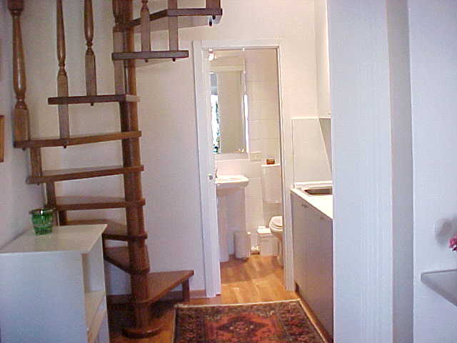 Description: This nice sized duplex is very quiet and comfortable. It includes : - a cozy bedroom on the top floor, with a queen size bed - a sunny living room with a brand new convertible couch, TV, VCR - a completely equipped kitchen area (just next to the stairs), - a modern bathroom with power-shower, toilet, - air conditioning. - ADSL (WIFI)